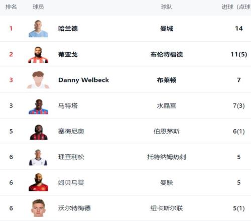 金靴的爭奪無疑哈蘭德是頭號熱門。他13場聯賽打進了14粒進球,場均進球數超過1球。不過,近段時間他的狀態有些低迷,各項賽事連續3場比賽都沒有進球,包括2場聯賽和1場歐冠比賽。哈蘭德雖然在射手榜占據優勢,但并不是沒有競爭對手。本賽季出現了一名天才射手,他13場打進了11球,排名射手榜第2,緊追哈蘭德。他就是布倫特福德的前鋒伊戈爾-蒂亞戈。