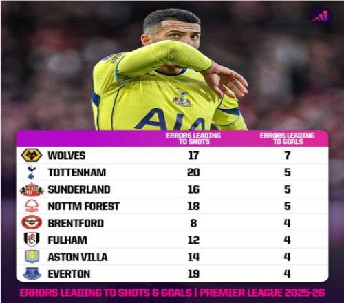 根據統計,到目前為止,在本賽季的英超聯賽中,熱刺已經出現了5次導致對方進球的失誤,僅次于狼隊的7次。熱刺還在導致對方射門的失誤次數方面位居聯賽首位,共有20次。